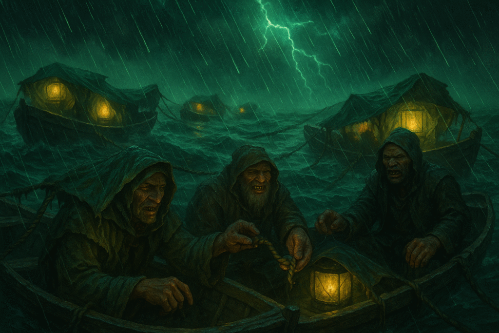 Through the white and green, shapes gathered: boats lashed bow to stern, a ragline of skiffs and yawls and derelict longboats, canvas patched with prayer flags and sailcloth, lamps slung under tarps to make a lane of light where there shouldn’t be any. Faces peered from oilskins and masks sewn from eel hide.