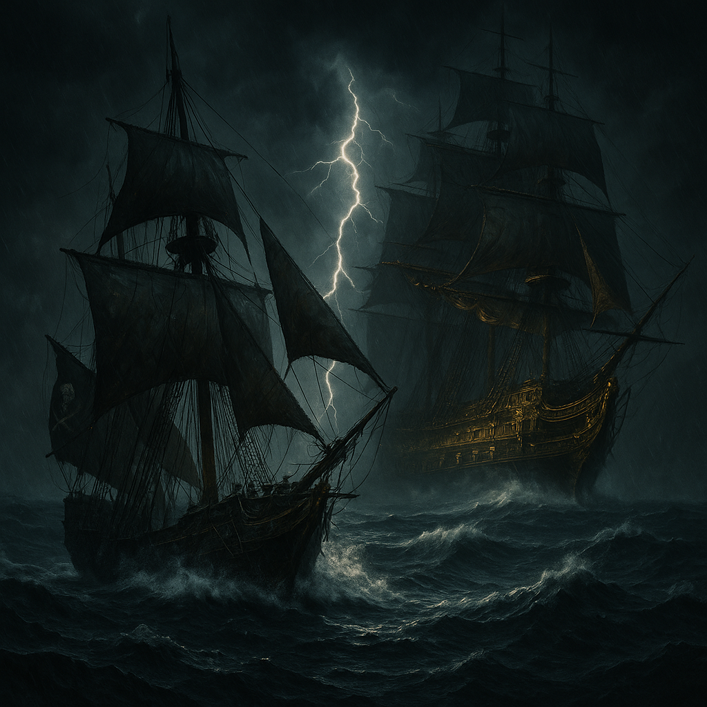 The wind howled through the sails, and the storm lashed against the decks of the pirate brig Crimson Horizon. At the helm stood Captain Silas Blackthorne, his single black eye fixed on the raging sea. His scarred hand gripped the wheel like it was part of his body.