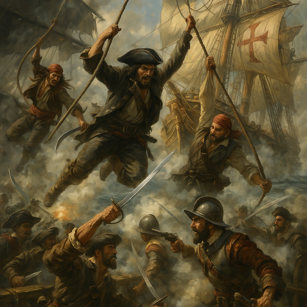 When the storm eased, the brig drew alongside the galleon. Grappling hooks flew, ropes snapped taut, and the pirates swarmed across the gap, roaring with cutlasses raised. Steel clashed against steel, pistols thundered, and the air filled with smoke and screams.