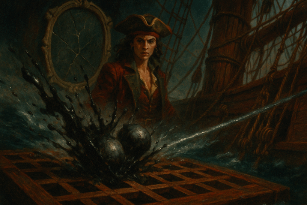 They ghosted in under topsails. Every miss-step would bill them minutes they could not spare—or worse, freeze them in a moment the way spray freezes on a yard in Arctic tales. Astern, the Santa Lucía kept station, her cracked Ash Mirror bandaged in brass, her surveyors launching pale kite-buoys with eyes inked on their bellies. The kites tugged at the grid, pinning seams open where the frigate wished them open.