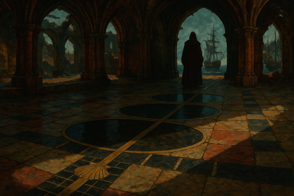 The cloister’s floor was a map laid in shell and jet. At its heart ran a meridian line inlaid with brass, pocked by old impacts, polished by bare feet that hadn’t walked in a hundred years. Where the sun fell through the arch, the line shone.