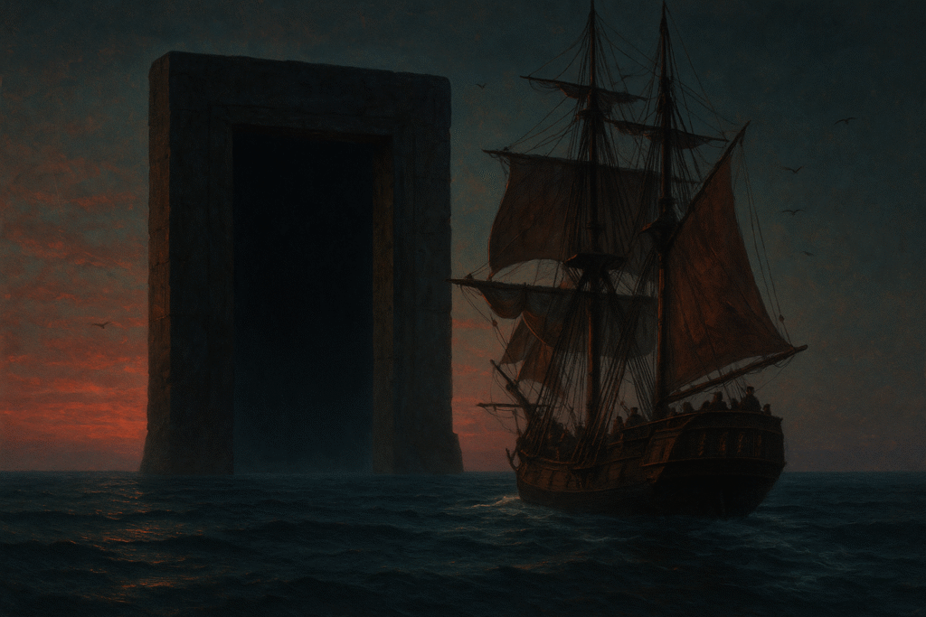 The reef rose like a ledger left out in the rain—pages warped, entries still legible. The abbey lay low to the water, slate roofs torn to teeth. In its court stood a meridian arch: two stones and a lintel, inside which the sun poured a bar of gold as narrow as a promise.