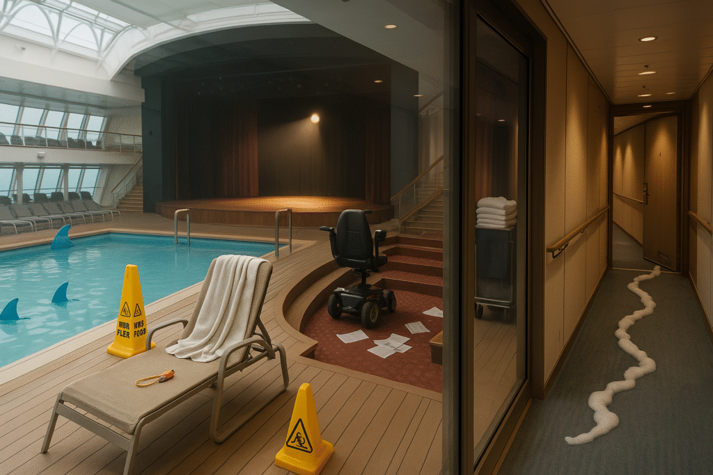 Sometimes, the spectacle is not a protest but a mishap of epic proportions. In one ship’s theater, a woman on a mobility scooter attempted to park at the top of the tiered seating. Accidentally hitting the accelerator instead of the brake, she launched herself and the scooter from the third level, flying through the air and crashing down multiple flights of stairs while still on the machine. The show was immediately canceled as the audience watched in horror and medical personnel rushed to the scene.3 The absurdity can even extend to shore excursions, as one group discovered when a drunk fisherman decided to release the tiny baby sharks he had been catching directly into the kiddie pool, thinking it was a hilarious prank.4