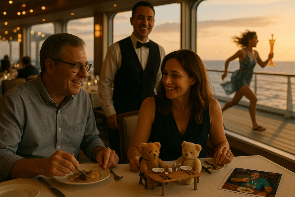 Cruises are also populated by unforgettable solo acts, individuals whose peculiar habits or incredible stories of resilience make them legends of the voyage. One couple was regularly seen in the main dining room with their two teddy bears, who were treated as honored guests with their own miniature chairs and a tiny table set upon the main table. Another passenger, a woman known for being a “pier runner” (someone who nearly misses the ship’s departure), was observed on multiple occasions faced with a choice: save her tube top/bikini top or her souvenir cocktail glass. She always chose the glass.